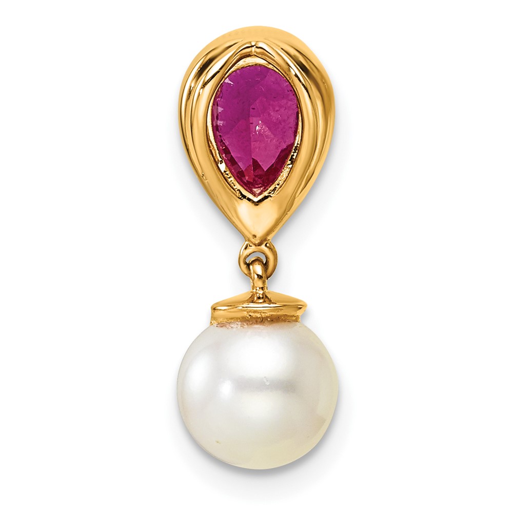 14K 6-7mm Round White Freshwater Cultured Pearl/Pear Ruby/Diamond Teardrop Chain Slide