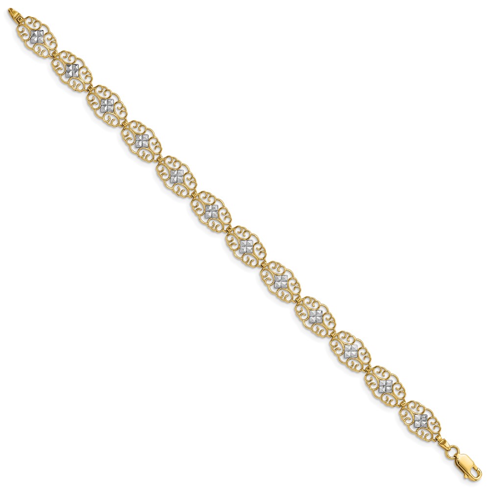 14K and White Rhodium Diamond-Cut Filigree Link 7.5 inch Bracelet