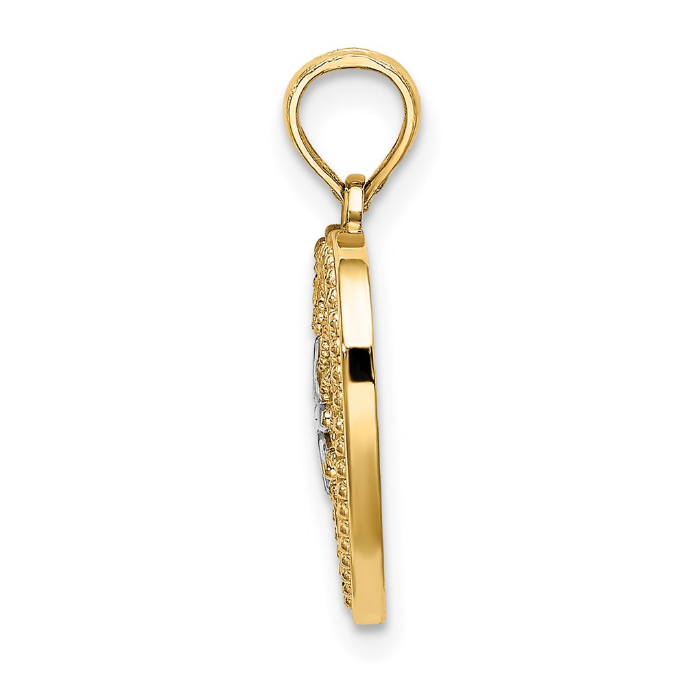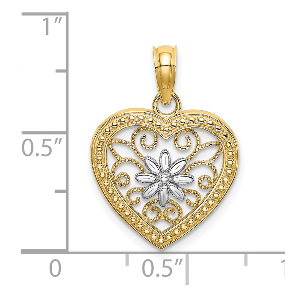 14k and White Rhodium Textured Flower Filigree Heart Charm