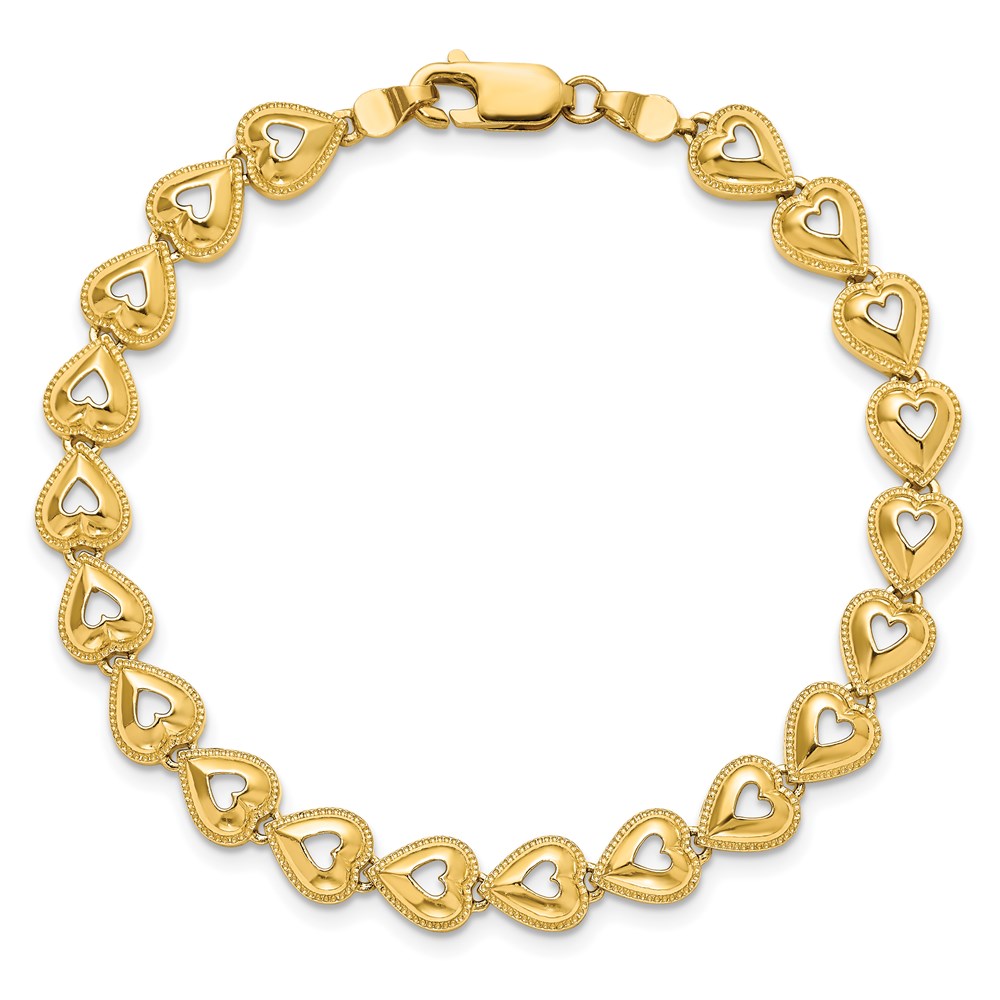 14K Polished Beaded Cut-out Hearts 7 inch Bracelet