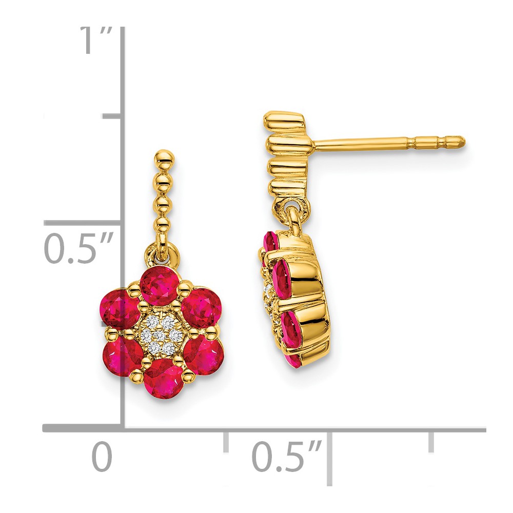 14k Polished Ruby and Diamond Floral Dangle Post Earrings