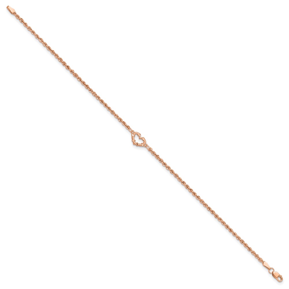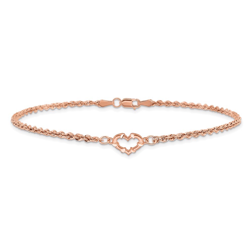 14k Rose Gold Diamond-cut Open Heart and Rope Chain Anklet