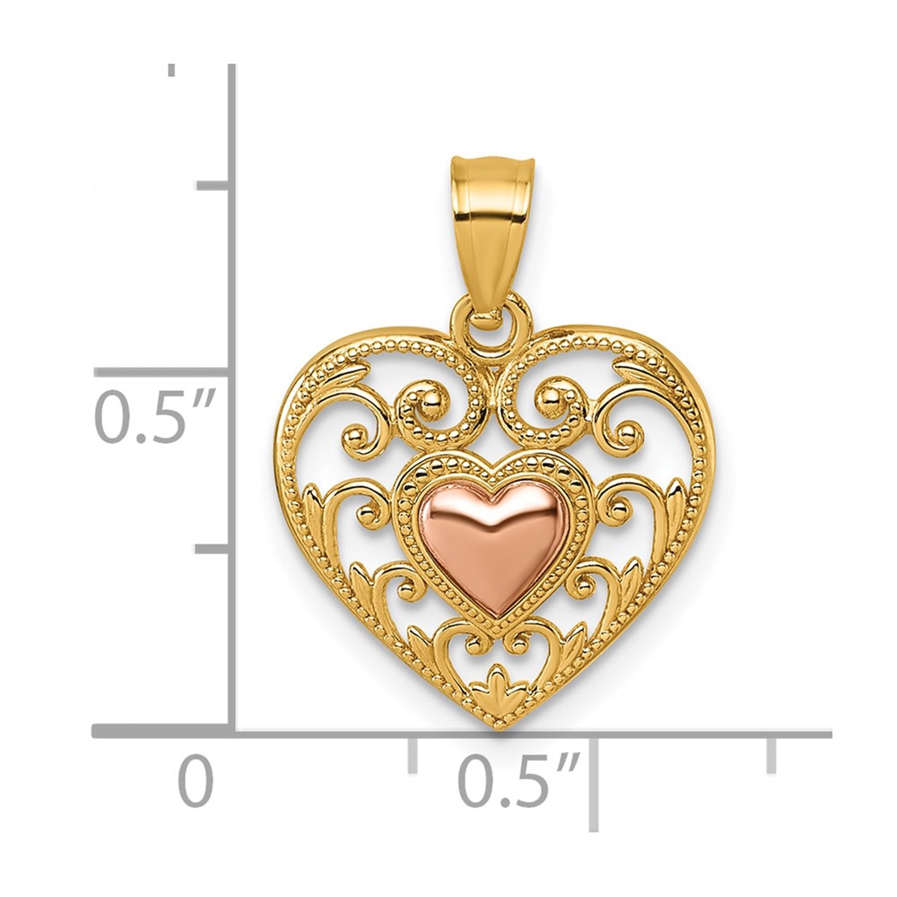 14k Two-tone Polished And Textured Fancy Filigree Heart In Heart Pendant