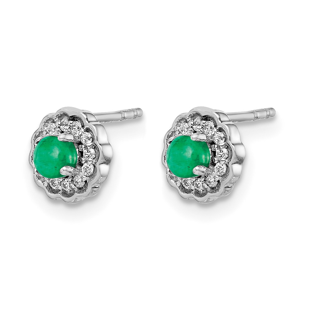 14k White Gold 3mm Round Emerald Cabochon and Diamond Halo Post Earrings