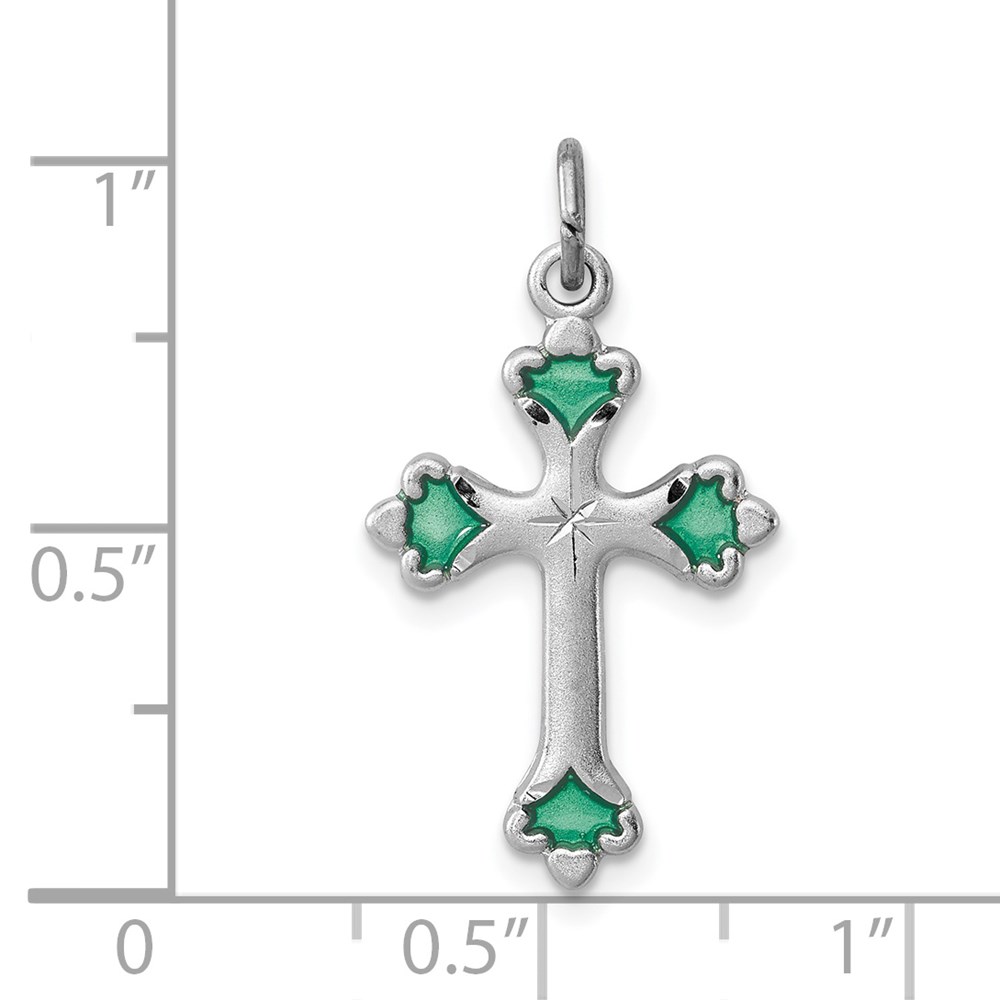 Sterling Silver Platinum-plated Green Enameled Budded Cross Charm