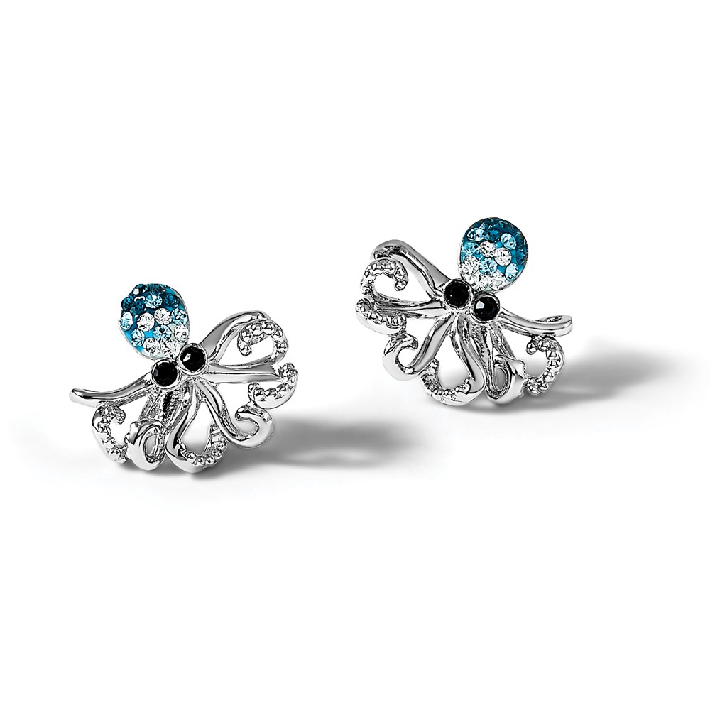 Sterling Silver Rhodium-plated Polished Blue and White Crystal Octopus Post Earrings