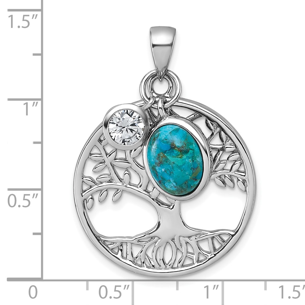 Sterling Silver Rhodium-plated Polished CZ and Compressed Turquoise Cabochon Tree of Life Pendant