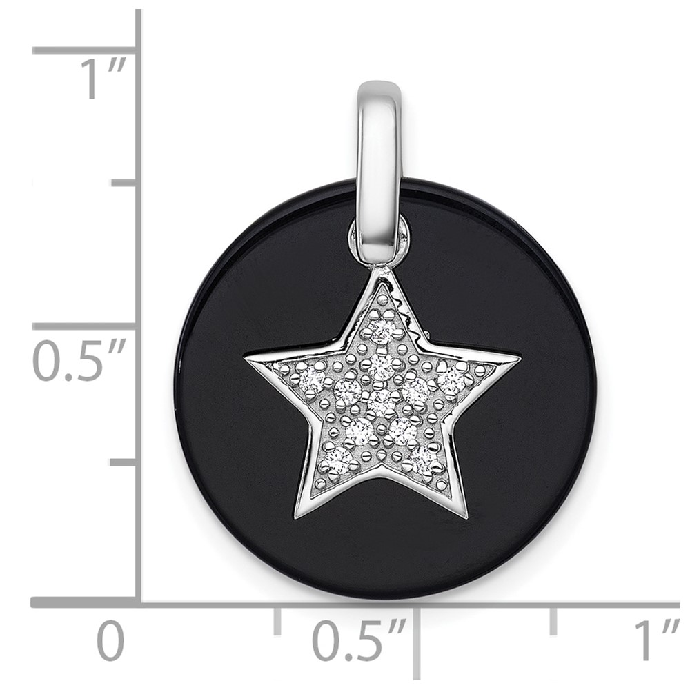 Sterling Silver Rhodium-plated Polished Onyx Circle with CZ Star Dangle Pendant